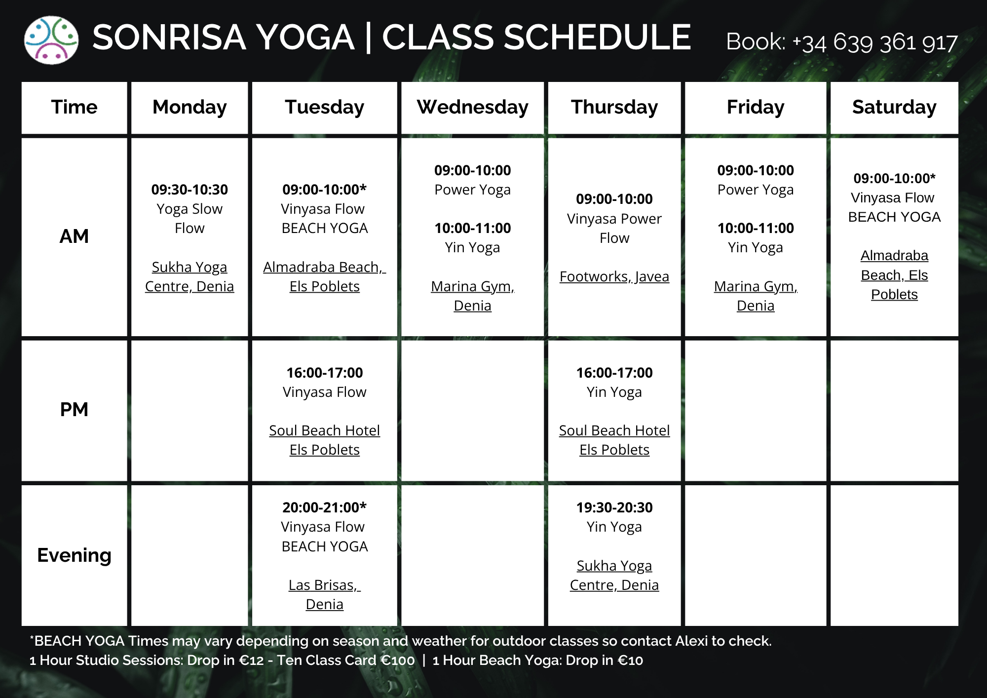 Below are the details of all regular classes, located in Els Poblets, Denia and Javea.